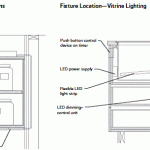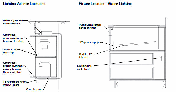 Manufacturers: Amerlux (LED accents at vertical cases); Bartco (linear fluorescent valence); Edge Lighting (vitrine LED); and KKDC (linear LED at shelving)