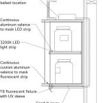 Since there was nowhere else to hide the fixture, uplighting the specimens from the front of the shelf area provided the best results. Atelier Ten selected concealed 3200K LED strips for their minimal profile, warm color temperature, and integral aluminium reflector (see right). Waist-high horizontal displays of Cushing’s manuscripts, books, and print material were also illuminated with concealed linear 3200K warm-white LED strips. For the vertical glass-front cabinets, an adjustable point-source LED accent luminaire was selected.
