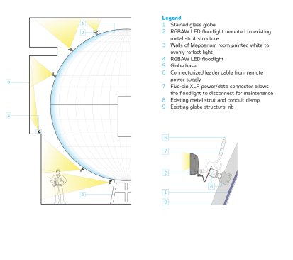 Philips Color Kinetics: ColorBlast TRX luminaires with RGBW and amber LEDs for backlighting the globe • Pharos Architectural Controls: Control system for operating the LED lighting