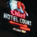 The Chief Hotel Court opened in 1939 near Las Vegas’ downtown district at 1201 E. Fremont Street. The neon sign that remains from the property was created circa 1940, making it one of the oldest neon signs in Las Vegas today. It has been completely restored and is now installed as part of the Neon Museum’s Downtown Gallery on Fremont Street at Las Vegas Boulevard.