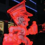 Founded in 1907, Anderson Dairy’s “Andy” Anderson sign was created in the 1950s by designer Herman Boernge. The playful neon version of the cartoon “Andy” Anderson mascot remained at the dairy until 1994 when he joined the Neon Museum’s Downtown Gallery, a collection of nine restored signs installed as public art near Fremont Street and Las Vegas Boulevard.