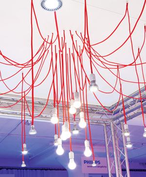 The lamps took center stage in Toshiba’s installation, with an elaborate chandelier showcasing the company’s myriad lamp types, color temperatures, and light distributions. Varying-sized PAR and MR lamps were layered in different color temperatures and beam angles, surrounding Toshiba’s new 40W equivalent, dimmable A19 lamps. The A19 mimics a traditional incandescent bulb in shape, color temperature, and omnidirectional output, and demonstrates that beauty need not be sacrificed for energy conservation.
