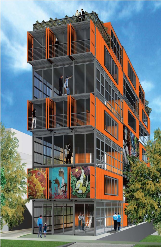 With concrete footings going in this summer and containers arriving around the end of the year, Price foresees completion next spring. Choosing containers over an all-steel frame, masonry, or wood, he says, was a financial decision with artistic and environmental benefits. The building will have roughly 50 percent recycled content by weight, passive solar design, radiant heating, low-VOC paints, and low-E glass. Rooftop photovoltaics, air-to-air heat exchange, and a graywater system are also possible, depending on budget calculations.
