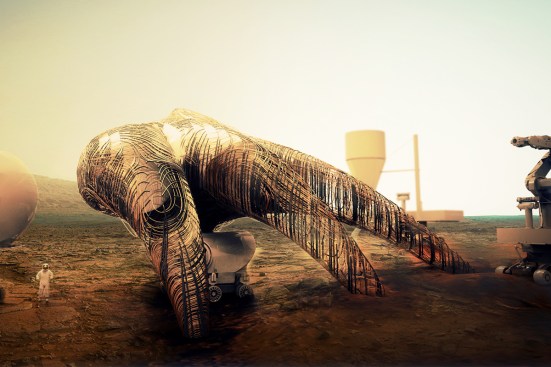 A runner up for NASA’s 2015 3D Printed Habitat Challenge Design Competition, this conceptual project proposed the use of a basalt (a volcanic rock found on the Martian landscape) composite to create concrete-like shells for building construction.