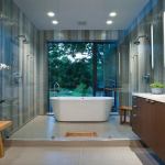 Energy: R-23 Johns Manville Spider insulation / Thermal Windows’ double- and triple-pane low-E windows with an average U-factor of 0.32 and SHGC of 0.26 / 21-SEER Trane HVAC system with ERV / Lightolier energy-efficient fluorescent fixtures / KitchenAid Energy Star appliances / Bosch Energy Star Axxis washer | Resources: FSC-certified framing and ipe wood deck / mulch made from lumber of previous house | IAQ: Sherwin-Williams no-VOC Harmony paint / 3form Varia ecoresin doors with 40% pre-consumer recycled resin / hard-surface flooring throughout / bath and garage fans with occupancy sensors | Water: WaterSense-certified Kohler faucets / Duravit and Caroma dual-flush toilets / rainwater harvesting system