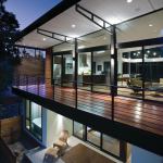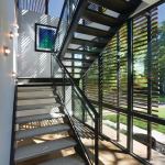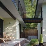 Designed as a modernist take on a treehouse, the home is crafted with simple lines, down-to-earth materials, and muted colors accented by unique touches such as stair treads from Enviroglas, made from recycled brown glass and porcelain from old toilets. A two-story window wall continues the indoor/outdoor theme and floods the front of the home with daylight.