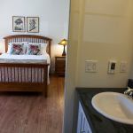 A pocket door separates the first-floor master bedroom from the ADA-compliant bathroom. The doorway is wide enough to admit a wheelchair if necessary.