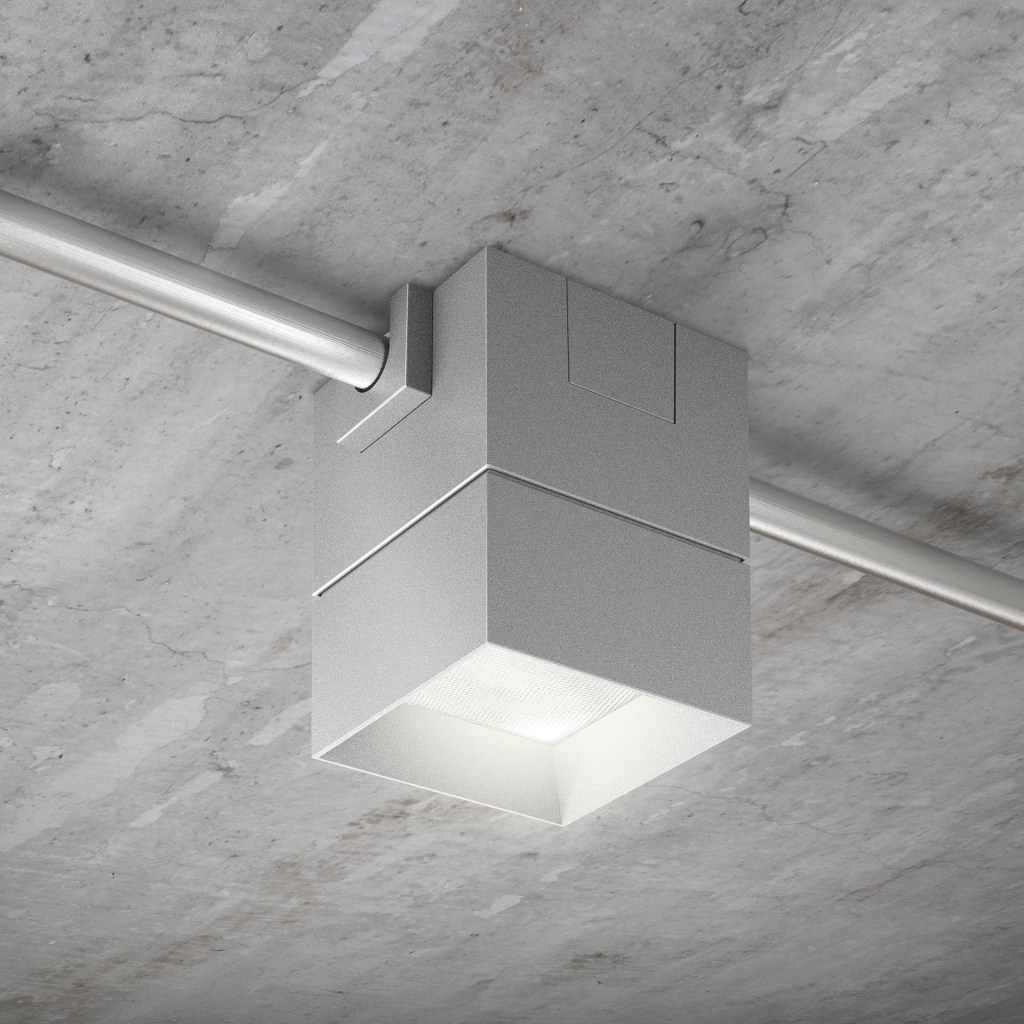 BeveLED Block, USAI Lighting • This fixture is designed for direct installation onto a finished ceiling when recessed lighting is not possible. Classic white—in 9W, 12W, 16W, or 24W—is offered at 2200K, 2700K, 3000K, 3500K, or 4000K. Warm dimming glow—in 16W—is offered at 2700K, 3000K, or 3500K. Both are available at a CRI of 80 or 90 respectively with multiple conduit mounting configuration options. • usailighting.com