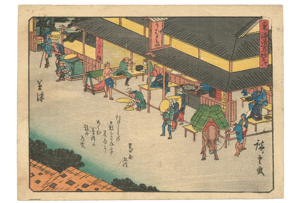 Consider antiques, including woodblock prints by Frank Lloyd Wright’s favorite artist, Utagawa Hiroshige (1797–1858), because they don’t add carbon to the atmosphere. Wright spent nearly a half-million dollars on ukiyo-e woodblock prints during his time in Japan, and often referred to Hiroshige as the greatest artist in the world. Astonishingly, an original impression from Hiroshige’s series The 53 Stations of the Tōkaidō can be had today for a few hundred dollars (Kusatsu – Travelers stopping at mochi shops shown). artsanddesignsjapan.com
