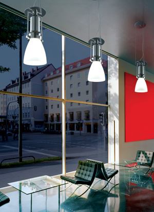 The Airport pendant luminaire is designed to provide a general or directed light distribution, has two reflector options—opal glass or metal—and can be used with a 42W GX24 lamp, a 70W G12 lamp, or a 150W G12 lamp. The housing is finished in matte nickel and the steel-cable suspension allows for field adjustability. The fixture is both rotatable and tiltable, works with an electronic ballast, and can be dimmed. Overall dimensions are 56.5 inches tall to the ceiling canopy mount and 3.8 inches in diameter at the bottom of the reflector. www.inter-lux.com/manufacturer/schmitz