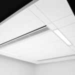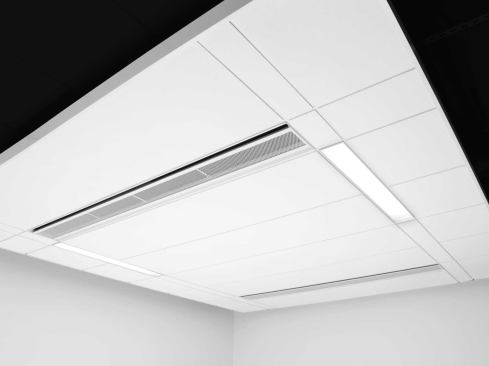 The chilled beams feature three nozzle sizes to optimize induction, vertically mounted heat exchangers with condensate trays, and a perforated induced air grille. Two heat exchangers are available: a two-pipe system for cooling and a four-pipe system for cooling and heating. The beams come with lockable sliding hanging brackets and three border-style options are available to coordinate the mean, T-bar system, and tile combinations.