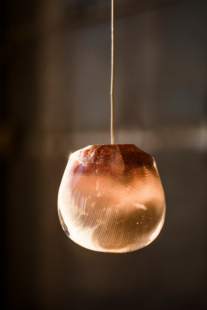 Spherical white glass blown into a copper mesh basket is enveloped by hot, clear glass to form the shape of each glass sculpture in the 84 series. The bulbous piece can be fitted with a 10W xenon lamp or 1.8W LED. As each blown glass piece is unique, the pendants vary in terms of shape and mesh distribution. The 1.1W LED fixtures are available as singular pendants or in clusters of up to 36 individual glass balls.
