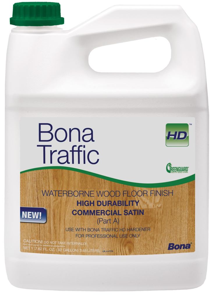 Bona Traffic HD is a two-component commercial waterborne finish for wood flooring that emits 40% fewer VOCs than comparable products and dries in two to three hours. Twenty-four hours after application, Traffic HD demonstrates greater scratch, scuff, and chemical resistance than urethane finishes. The finish has been Greenguard Children & Schools certified. It is available in three finishes (satin, semigloss, and extra matte) and is clear and colorless, which allows the color of stained or natural wood floors to stay true and makes touchups easier. mybonahome.com