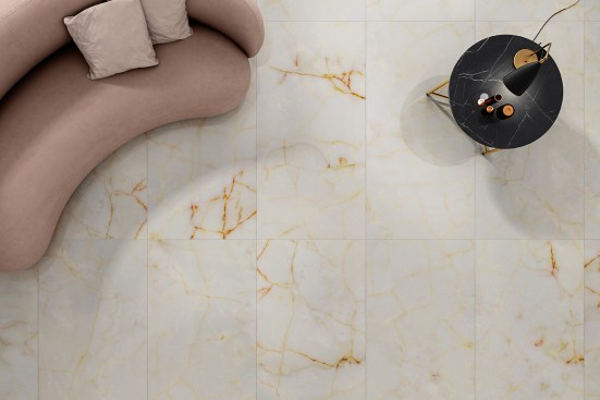 Inspired by some of the most refined marbles from around the world, such as Carrara, Onice, Nero Marquina marble, and Arabescato Bianco, the Majestic collection by Valentino features irregular veining that traverses each porcelain tile. Each standard slab is offered in 47.2″-square, 23.6″-by-7.2″, 23.6″-square, 11.8″-by-23.6″, and 3.9″-by-20.8″ formats. Available in more than 150 graphic varieties and in six colorways, including majestic onyx (shown), glam black, and imperial pearl, and with a natural or polished finish. ceramichepiemme.it/valentino
