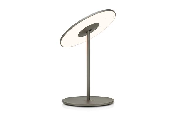Circa, designed by Pablo Studio, provides ambient lighting for residential and contract spaces. Available in floor, table (shown), wall, or pendant versions, and in two finishes—white or graphite—the luminaire features a 12″ flat-panel 2700K, 85 CRI LED light source that can be rotated 360-degrees and tilted 45-degrees in two directions. (The fixture head on the floor lamp version has a diameter of 16″.) Circa has a light output of 385 lumens, uses 11W of power, and offers four-stage dimming control. The table, floor, and wall versions have an optional USB charging port. pablodesigns.com