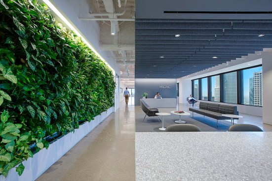 “These PET felt ceiling baffles, as shown in our MGAC’s Los Angeles Office project, yield a rich texture while optimizing the volume of the space. They have an NRC 0.75 acoustic rating, and are LBC Red List Free.” turf.design