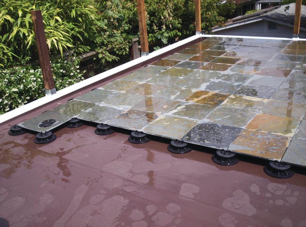 Designed specifically for paver or duck-board overlay, Ultra Plazadek from Duradek is a waterproof vinyl sheet membrane designed for roofing applications, such as roof decks and balconies. It is installed by trained applicators, offers a 10-year warranty, and has many options for perimeter details, allowing water to drain to a gutter or drain-and-scupper system. A drainage mat is available to put between the paver and the membrane to allow water to drain while keeping dirt and other contaminants from building up. Plazadek is a model of Duradek Ultra, a 60-mil PVC membrane capable of withstanding pedestrian traffic. duradek.com