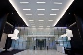 In this type of application, ‘knife edge’ profiles have become popular. This type of system has a sharp leading edge and a top surface which rakes back away from the front edge, minimizing the appearance of any upstand required to conceal the light source behind. The fact that the leading edge of the profile creates the finished edge of the surface ensures perfectly crisp detail, something almost impossible to achieve with traditional techniques. A great example (and the original of the type) is the Whitegoods Edgeless Cove system, which was specified to deliver an exceptionally long (over 100 foot) coffer in the ceiling of the BMW showroom on Park Lane in London’s Mayfair. The effect creates a luminous raised section of ceiling, deliberately designed to reflect in the bodywork of the vehicles below, accentuating their curves and form.