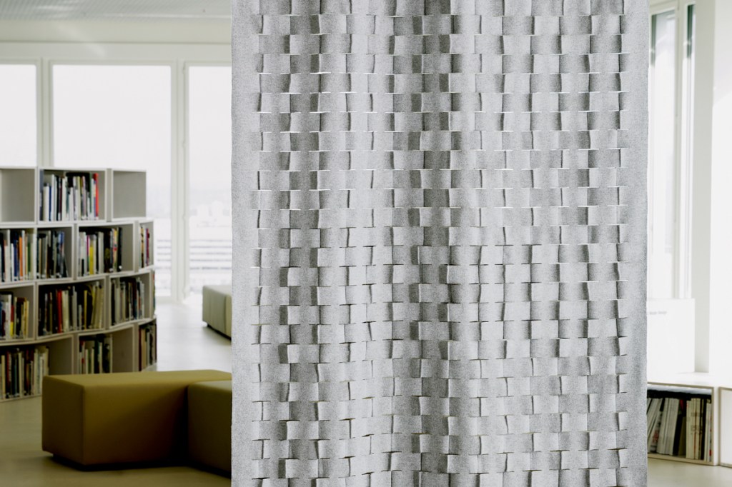 Laser-cut to create a woven pattern, Entrada is sewn into its 3D form for use as drapery or acoustic paneling. The fabric is composed of 100 percent flame retardant Trevira CS polyester which closely resembles the aesthetics of wool felt. A single panel measures 47″-wide-by-118″-long, and can provide a noise reduction coefficient (NRC) of 0.45 when draped flat or an NRC of 0.65 when hung. Entrada comes in six colors including gray (shown), purple, and green. carnegiefabrics.com