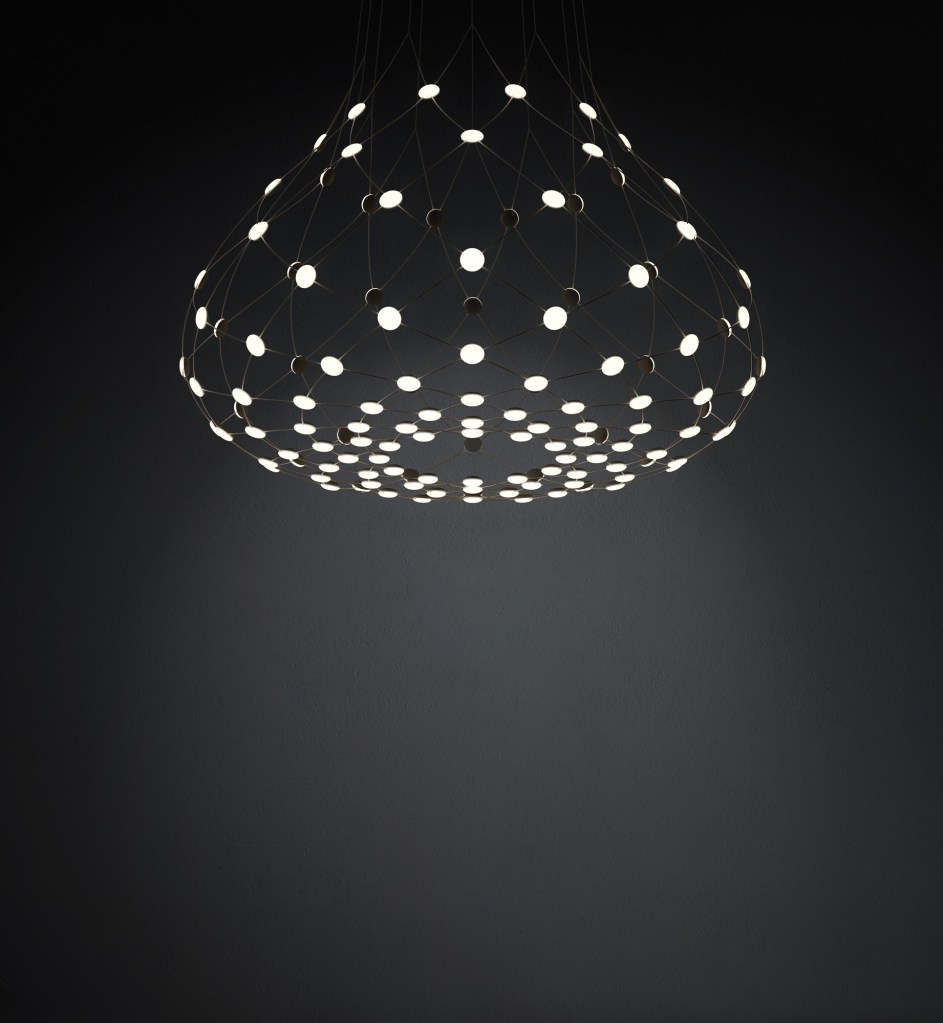 Mesh, Luceplan • “I set out to create a lamp by starting with this capacity for spatial separation of LEDs, scattering them to optimize the spread of light, but above all with the aim of giving each of these points of light its own independence,” says designer Francisco Gomez Paz of his latest design for Luceplan. Measuring 110cm in diameter by 90cm tall (43.3″ by 35.4″), the LEDs appear to “float” in a net of fine steel cables finished in black. Dimmable, with light output to 8,000 lumens. •