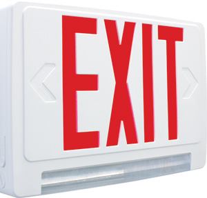 Exitronix Revolution, Barron Lighting Group Revolution is a compact exit combo-unit with an adjustable LED lightbar. The sign measures 12.6 inches wide by 9.1 inches (to the top of the mounting plate). The sign depth is 1.9 inches and the ceiling mounting plate is 4.3 inches wide. The exit face is available in either red or green high-intensity LEDs that provide up to 90 minutes of run time. The housing is composed of injection-molded, UL94 V-0 flame-rated, high-impact thermoplastic in either white or black. The sign is UL-listed for damp locations barronltg.com