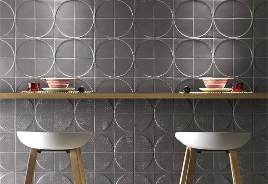 1. Diesel Living, the home–goods arm of the well–known clothing brand, brings its edgy vibe to Pluriball, a collaboration with Iris US. The porcelain tile takes its design cue from bubble wrap. Within the circles, there’s a relief pattern that resembles faded coins. irisceramica.com
