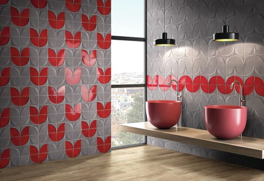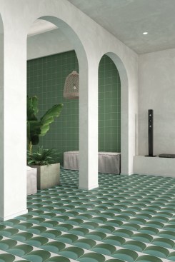20. Mixing up the matte, glossy, and textured tiles in the D’Aurore Collection from Natucer allows a total change-up in the aesthetic, depending on placement. Here, a rhythmic circle design piques interest with its dimensional surface. natucer.es