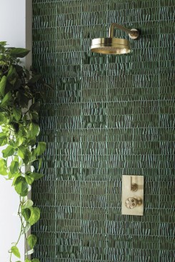 3. Spotlighting an old-fashioned fabrication process, AlysEdwards Tile & Stone delivers a rich, textural modern effect. Rok Candy, an artisanal 6-by-6-inch terra cotta wall tile shown here in emerald, is hand–pressed into molds. The clay is fired, the textured bisque hand-glazed, and then fired again, creating a sugary crystal effect with depth and some crackling. Matching ½-by-6-inch liners available. alysedwards.com