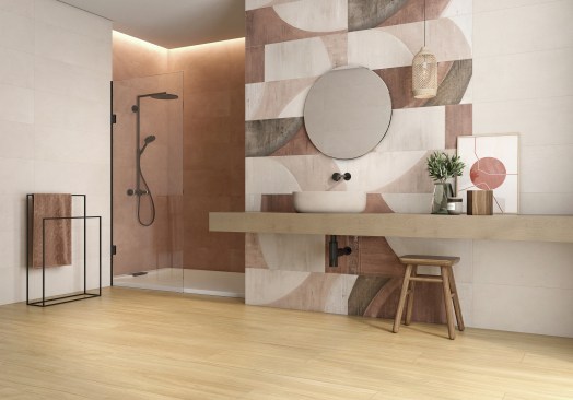 9. Part of the Terra collection from Halcón Ceramicas, faded geometrics in soft terra cotta and blush tones resemble aged plaster. Creative installations such as this one, which stops mid–wall, suggest a hand-painted mural. halconceramicas.com