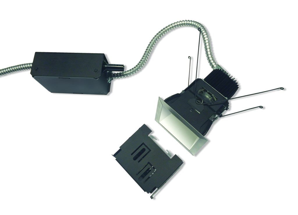 Fitted with a high-output, multi-chip LED array, this recessed downlight is available in 2700K, 3000K, 3500K, and 4000K and delivers up to 1,588 lumens. Adjustable up to 45 degrees when installed in a 1/2″ to 1″ ceiling and to 30 degrees in a 1-1/2″ ceiling. The mechanism adjustment includes gradation marks every 15 degrees as well as a set screw to lock the tilt adjustment. It is offered with spot, medium, and flood beam distributions. contechlighting.com