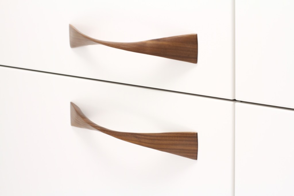 A simple twist makes this elegant pull easy to grasp. Part of the New Jersey–based company’s Designer Wood Collection, it comes in two lengths of 10.62″ and 15.25″. It is made from a single wood block of walnut or oak with a lacquer finish. manzoni.us