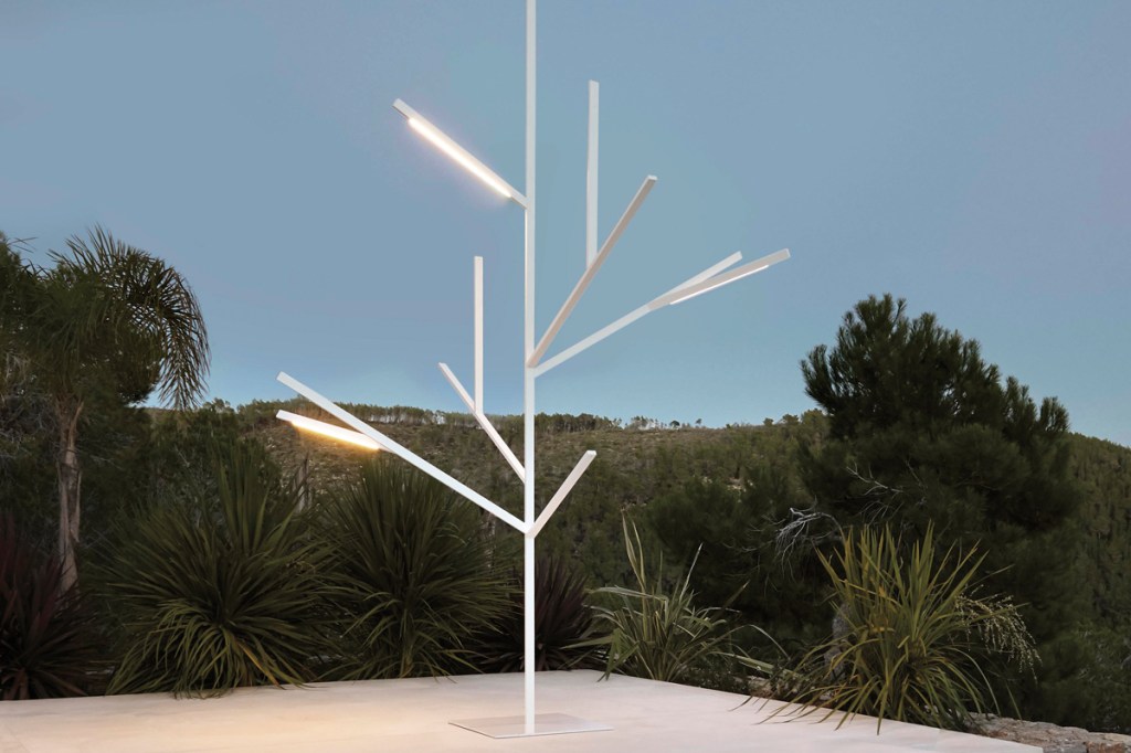 This tree-inspired LED luminaire provides warm, 2700K light outdoors. Its thermo-lacquered aluminum frame comes in five colors, including white (shown), bronze, and anthracite. gandiablasco.com