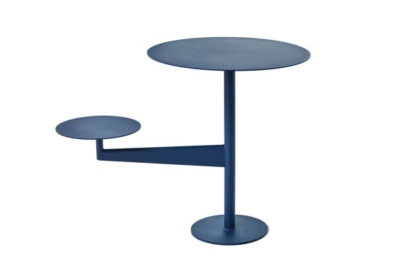 Up to three fixed stools branch out from a central table in this one-piece patio set. Pivot’s table is 28″ tall, while seats are at either 18″ or 24″. Color options include beige, green, and blue (shown). brda.se