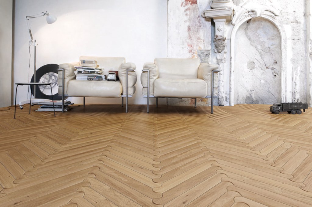 This is a puzzle-like collection of FSC-certified hardwood flooring featuring rounded edges with a slight bombé effect.