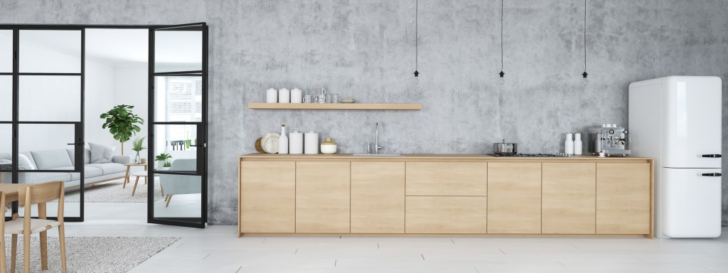 There’s a good reason concrete floors are often used in commercial kitchens: They are seamless, incredibly durable, and easily stand up to constant foot traffic, food and drink spills, and dropped cutlery. They also resist food and oil stains, water, and abrasion when properly sealed. In residential kitchens, concrete floors offer the same benefits, and can be finished in a variety of colors and decorative patterns. For a more traditional look, you can even stain and lightly texture them to resemble natural stone or wood.