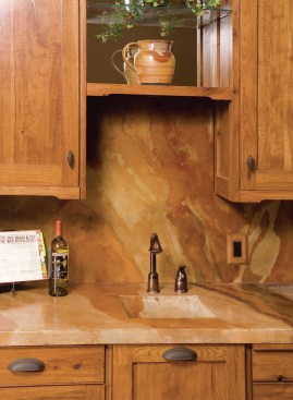 Concrete backsplashes are the perfect complement to concrete countertops and sinks, especially if you want to create a cohesive look and match the countertop. But you don’t have to stop there. To add decorative interest, cast the backsplash using different colors, designs, shapes and custom inlays. Other design options include hand-carved overlays that mimic tile and unusual free-form shapes. Concrete backsplashes are also ideal for remodeling projects because they mix well with existing countertop materials, such as tile or granite, and are easy to retrofit.