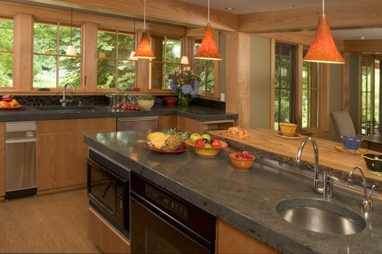 Using concrete to build kitchen countertops and islands provides infinite design options. You can vary the shape and thickness, create long seamless runs and form custom edge details. While all countertop materials have a wide array of color options, concrete gives you the ability to completely customize the color using integral pigments and stains. Or, you can simply leave the concrete its natural gray color for an organic, unadulterated look.