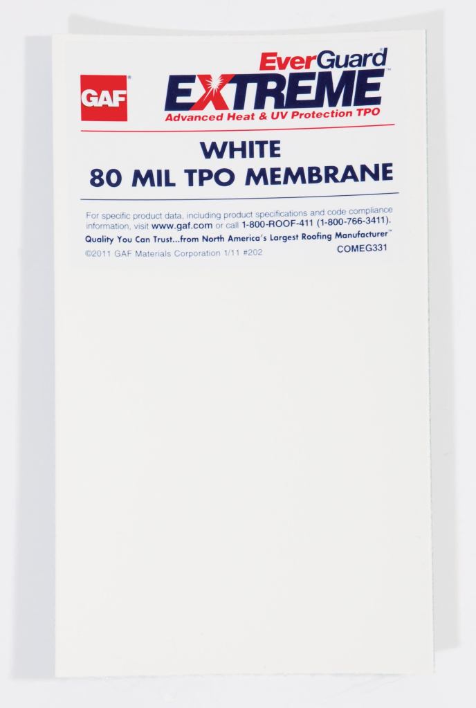 EverGuard is a collection of single-ply thermoplastic polyolefin roofing membranes from GAF Materials Corp. Available in 45-, 60-, and 80-mil (shown) thicknesses, as well as in an Extreme option that has higher heat and UV protection, the roofing provides a reflective white surface to help minimize heat gain in buildings. EverGuard is suitable for mechanically attached, fully adhered, or blast-applied applications. The membrane is Title 24 compliant and Energy Star and UL listed. • gaf.com