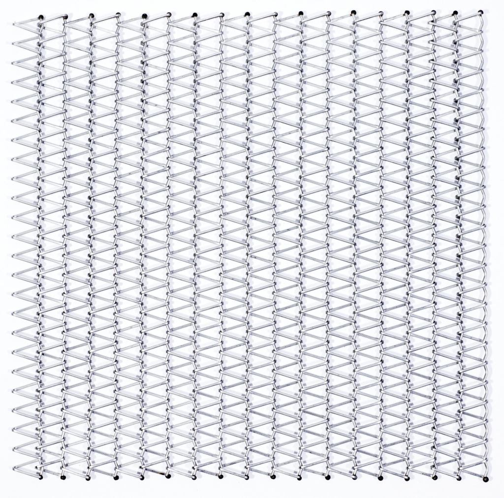 Helix 24 is a flexible metal fabric from GKD. Composed of crimped rods and flat strips (which measure 0.070″ wide by 0.050″ thick), the weave has a 61% open area and an overall thickness of 0.265″. Made from Type 316 stainless steel, Helix 24 weighs 0.90 lbs. per square foot and comes in a maximum width of 20′. Related weaves include Helix 6, Helix 12, and Helix 48. • gkdusa.com