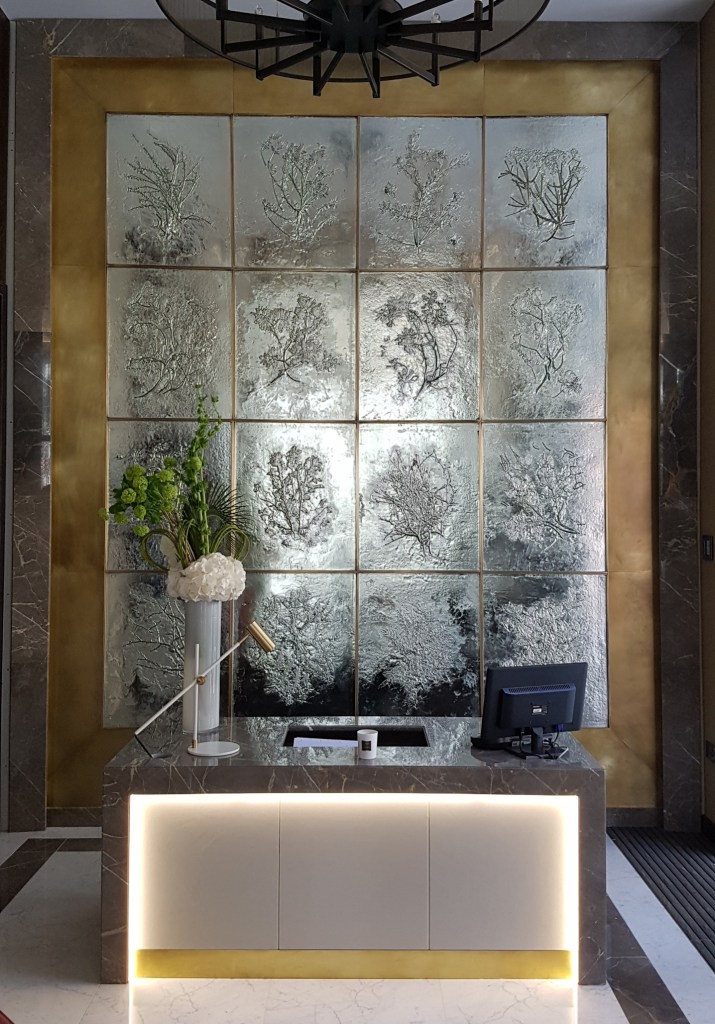 Each panel is made by melting glass over botanical matter, such as oak and olive tree branches, or strawberry vines.