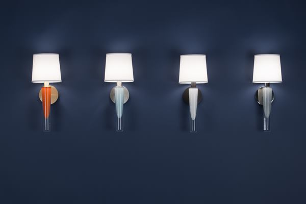 Boyd Lighting’s Grasse Sconce sports a two-tone, hand-blown candelabra-style glass stem that is offered with blue, gray, orange, and white accent colors. The sconce is lamped with either one type B10 60W incandescent or a screw-in LED positioned beneath a white linen shade. The fixture is 18 ¼” tall and 7 ¾” wide, and its mounting hardware can be specified in a variety of brass and nickel finishes. boydlighting.com