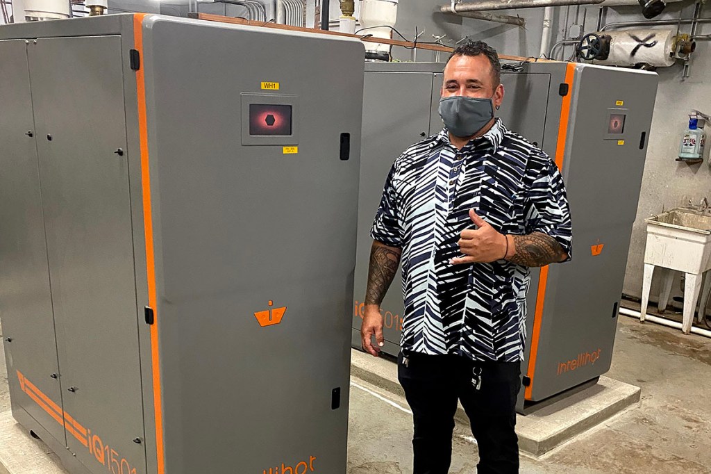 The 1.5-million-Btu Intellihot water heaters fit into a 3-by-6-foot footprint, offering immense space savings compared with the previous boiler system.