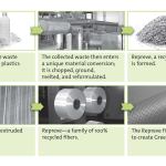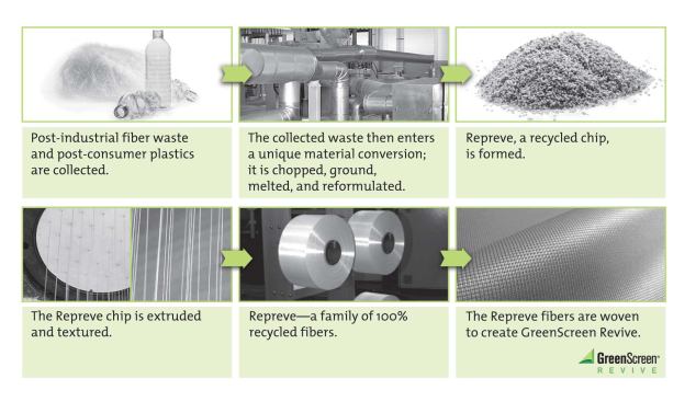 Hunter Douglas Contract’s GreenScreen Revive window shading fabric is made from 100 percent PVC-free polyester and contains a minimum of 89 percent Repreve fibers, which is made from 100 percent recycled materials. Each yard of GreenScreen Revive uses 11 post-consumer bottles. It is produced by collecting post-industrial fiber waste and post-consumer plastics, which are then chopped, ground, melted, and reformulated into Repreve, a recycled chip. The Repreve chips are then extruded and textured into fibers that are in turn woven into GreenScreen Revive. The line is available is 1 and 3 percent opennesses and eight colors; Fabric width is 118 inches.