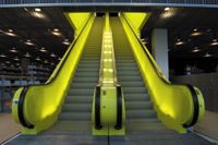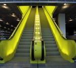 Arranged perpendicularly to the site’s steep slope to create a flattering exterior visual of the building at night, the inexpensive fluorescent striplights are hung in the stacks above a polycarbonate ceiling plane, which OMA also used in its design for the Prada Guggenheim store. Sam Miller of LMN explains that the polycarbonate diffuses light evenly without producing shadows and provides enough illumination for visitors to view books on the bottom shelves. The selected metal halide fixtures have perforated metal screens that offer transmissions of 20 percent, 60 percent, and 80 percent. In some areas, where these lights are hung above perforated and corrugated metal ceiling planes, KTA calculated the light loss to create a light pattern that Tillotson says, ‘provides ample and functional puddles of light.’ The budget prevented KTA from using dimmers; instead, occupancy sensors conserve electricity in low-use areas, such as the special collection section. KTA also backlit the eye-popping chartreuse escalators and elevator cabs to enhance the building’s wayfinding system, which includes, in lieu of navigational signs, the hierarchy of dots on the public floors and lines on the non-public floors.