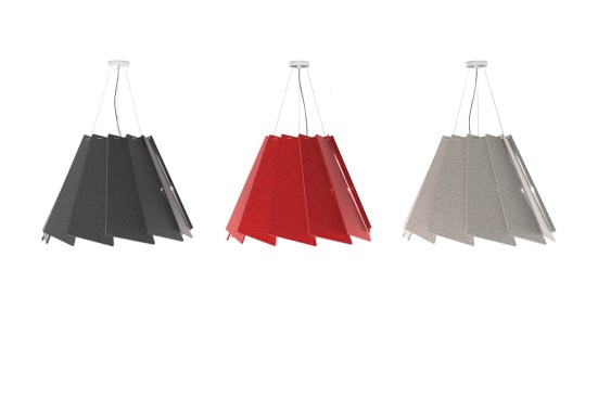 The signature feature of Mute, a decorative-style pendant, is its shade, which is composed of 12 polyester acoustic fins made of CNC-cut recycled PET bottles and wrapped in felt. The fins provide a Noise Reduction Coefficient rating of 0.75. The 24W LED luminaire is offered in 3000K and 4000K and uses 120V or 277V. The shade is available in three felt colors: red, charcoal (shown), and beige. eurekalighting.com