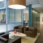 Combining elements of architectural interest with greater light intensities was a technique put to work throughout the headquarters. The designers opened up the ceilings to optimize the airy feeling of the space. Unassuming 28W T5HO linear indirect pendants set on dimmers provide illumination in the office areas. A custom polycarbonate box along the ceiling, holding 28W T5 fluorescent strips, washes the glass panels enclosing the adjacent private offices.