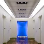 The entry sequence is the first example of this approach. Lit with recessed cove fixtures and AR111 lamps, the elevator lobby is a simple white box, with one exception: the company signage-a blue glowing frosted-glass panel, backlit with 28W T5 fluorescent strips. The real lure, however, is the decorative 48-inch-diameter cherry-wood chandelier hanging in the adjacent reception area, outfitted with 150W incandescent lamps. This draws visitors into the Town Square, illuminated with natural light by day, and by square recessed downlights lamped with compact fluorescents by night.