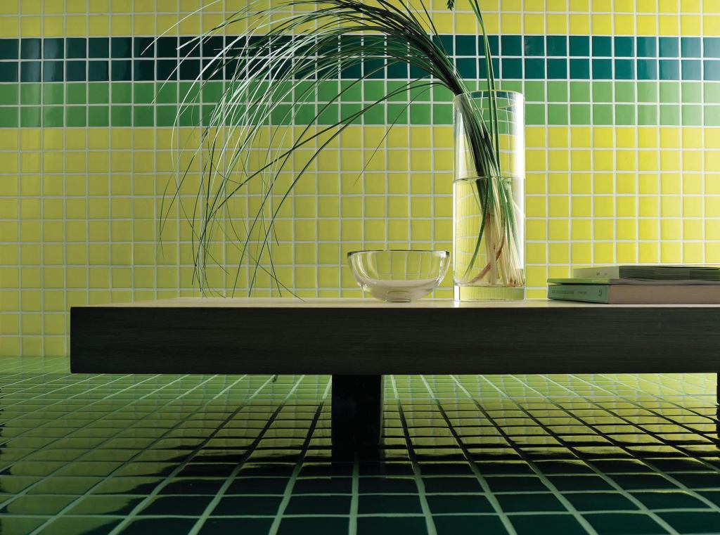 Area25 from Mosaico+ is a collection of sustainable glass tile available in a vivid color palette. Its sintered glass chips are created by grinding and pressing powdered glass from waste and recycled products. The manufacturing process results in glass field tiles that are very durable, allowing Area25 to be used in environments with heavy foot traffic. The field tiles measure 50mm by 50mm by 6mm, and are mounted on a 300mm-square sheet size. Area25 comes in 25 glossy colors and a R11 grip finish upon request. www.mosaicopiu.it