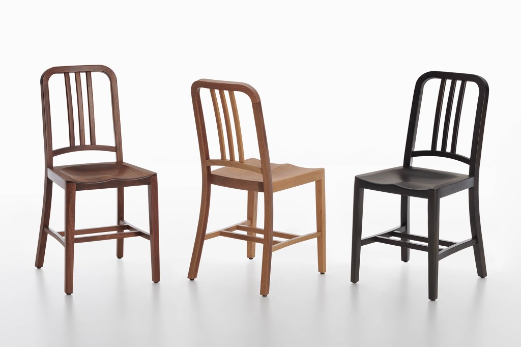 Emeco is celebrating the 75th anniversary of its iconic aluminum Navy Chair—originally designed for warships during World War II—with the launch of a wood version. Measuring 34” tall, 19.5” deep, and 15.5” wide, the Navy Wood chair is available in walnut, white oak, or black-stained oak sourced from sustainably managed forests according to Emeco. emeco.net
