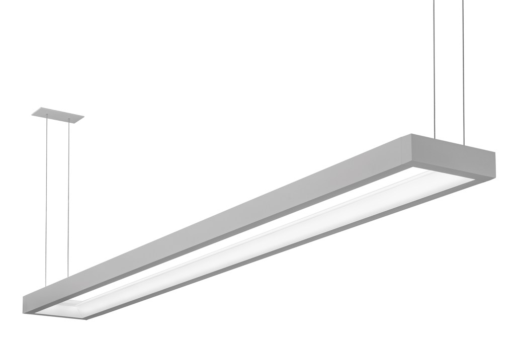 “Illuminating the Void” is the design concept behind this indirect-direct suspended luminaire. Available in 4′, 5′, 6′, and 8′ lengths, the fixture has a frosted acrylic optical diffuser and can be specified with three different distributions: 40/60, 60/40, or 70/30. Power is supplied through the suspension cables. Mounting options include grid, drywall, and surface-mount/open ceilings. Output range varies from 2,000 to 4,000 lumens depending on the selected wattage, available from 18W to 38W. Color temperature options are 3000K, 3500K, and 4000K with a color rendering index (CRI) of 80-plus. Works with multiple wired and wireless building lighting control systems. Finish options are palladium silver (shown) or white. focalpointlights.com